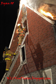 Several years ago. Camden FD NJ Eng-11 mans a 2.5 attack line as heavy fire takes over the front of the house, Both exposures were damaged.